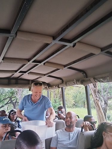 Image SLM (Providing service. Minister of Environment- Willie Aucamp serving reporters soft drinks aboard the truck, during game drive in KNP).