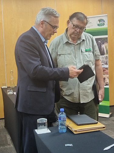 Image SLM (Minister of Forestry, Fisheries and the Environment, Willie Aucamp, consulting with an unidentified official at KNP).