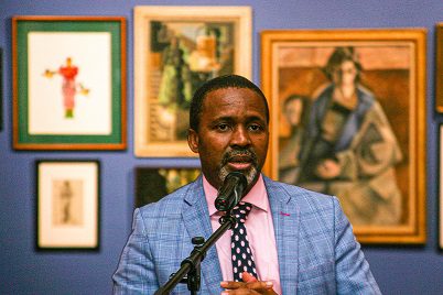 All images Jacob MAWELA (Vuyisile Mshudulu, director of the City of Johannesburg’s Arts & Culture, limned addressing the audience during the opening of the Homecoming exhibition at the Standard Bank Gallery in Johannesburg).