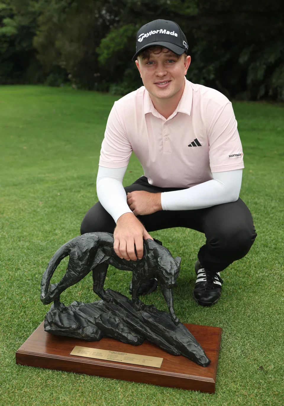 Image Getty ( 2025 Alfred Dunhill winner Jayden Schaper recorded with his curated trophy at the Royal Johannesburg Club).