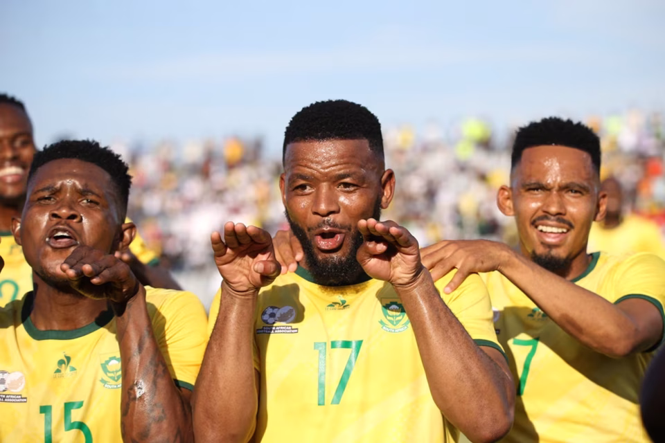 Image (Top drawer goal, Sipho Mbule celebrating with teammates after scoring his first for Bafana).