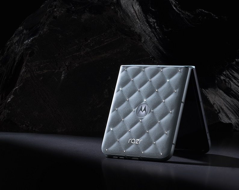 This collection includes the Motorola Razr 60, featuring a shimmering quilted soft lux texture finished in PANTONE™ Ice Melt, adorned with 35 hand-set Swarovski® crystals, including a 26-facet crystal on the hinge and crystal-inspired volume keys.