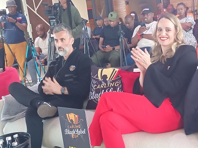Image Mdu Mphahlele (Former serial Bucs Cup coach winner Jose Riveiro, returns to SA, having led the Carling All-Star team to back-to-back triumphs in the Carling Cup in 2023. He’s recorded with Carling Black Label’s Brand Director- Kerryn Greenleaf, at the media launch in Sandton, today).